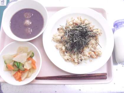 今日の給食「豚肉ときのこのばらずし・牛乳・浅漬け・白玉汁粉」