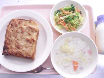 今日の給食「ツナポテトースト・牛乳・白菜のクリームスープ・フレンチサラダ」