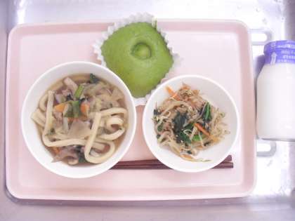 今日の給食「ちゃんこうどん・牛乳・もやしのカレーじょうゆかけ・ばばばあちゃんのなぞなぞむしぱん」