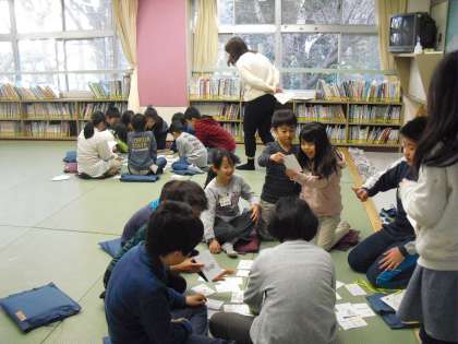1時間目は、たてわり班でかるた集会をしました。この取り組みは毎年行っています。以前、子どもたちが作った学校のことを知らせるかるたをたてわり班で楽しみます。学校の良いところ、楽しいことなどを知りながら、かるたとりをしています。
