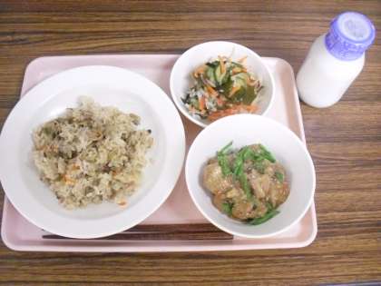 今日の給食「深川めし・牛乳・生揚げのそぼろあんかけ・はりはり酢の物」