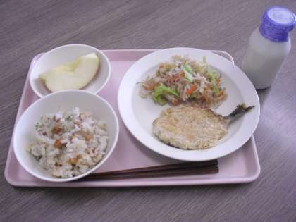 今日の給食「豆ご飯・牛乳・イワシのニンニク焼き・ごま酢かけ・りんご」
