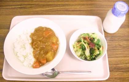 今日の給食「ハッシュドポークライス・牛乳・海藻サラダ」