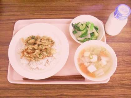 今日の給食「かき揚げ丼・牛乳・豆腐汁・野菜のレモンしょうゆかけ」