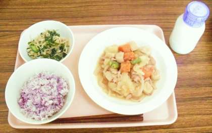今日の給食「ゆかりごはん・牛乳・肉じゃが・もやしとわかめの酢の物」