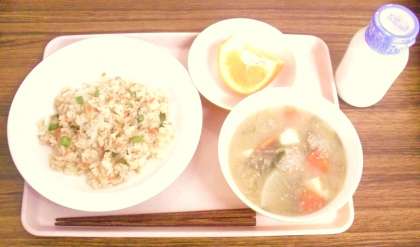 今日の給食「子ぎつねごはん・牛乳・あじのつみれ汁・いよかん」