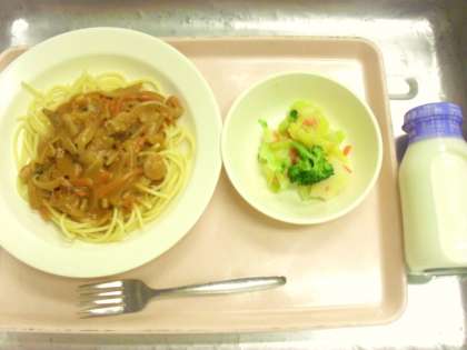 今日の給食「海老クリームパスタ・牛乳・イタリアンサラダ」