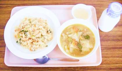 今日の給食「さけチャーハン・牛乳・ワンタンからみスープ・ももゼリー」