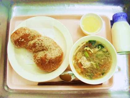 今日の給食「ごまあげぱん・牛乳・肉団子入り春雨スープ・果肉入りりんごゼリー」
