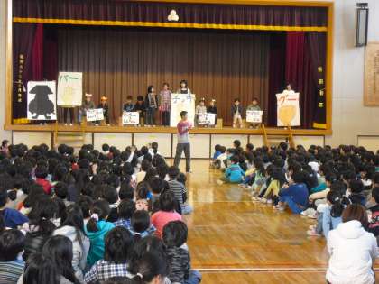集会委員会の子どもたちの演技力がレベルアップしていることがとてもよくわかります。アナウンサー役、レポーター役、クイズ回答者役などになりきって演じていました。集会委員会の子どもたちは、休み時間を使って準備しがんばりました。1年間で得たものは簡単には伝えることはできませんが、委員会メンバーとの仲間意識、一つの集会を仕上げるための手順など貴重なことを学んだことでしょう。