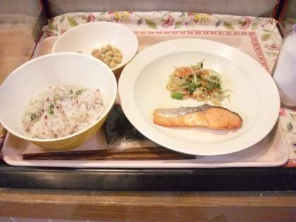 今日の給食「梅茶漬け・牛乳・鮭の塩焼き・切干大根の和え物・多度豆」