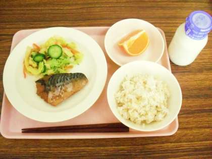 今日の給食「雑穀ご飯・牛乳・鯖のみそ煮・シャキシャキ野菜・たんかん」