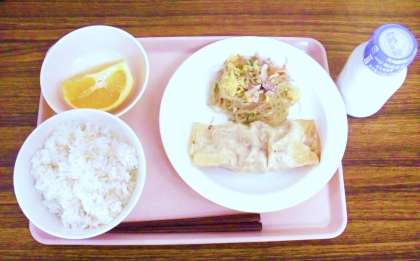 今日の給食「ごはん・牛乳・棒餃子・春雨サラダ・オレンジ」