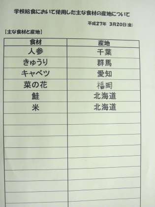 「今日のあけぼのずしには六年生をおめでたく祝う気持ちがあります。さけを多めにし、みんなの好きな紅白白玉ポンチを入れました。今日は、学年最後の給食なので、味わって、よくかんで、食べて下さい。」