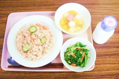 今日の給食「あけぼのずし・牛乳・おひたし・紅白白玉ポンチ」