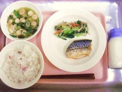 今日の給食「さくらのはなごはん・牛乳・鯖の塩焼き・おひたし・すまし汁」