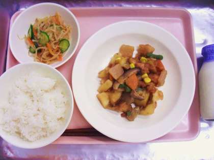 今日の給食「ごはん・牛乳・新じゃがの揚げ煮・もやしのコチュジャンかけ」