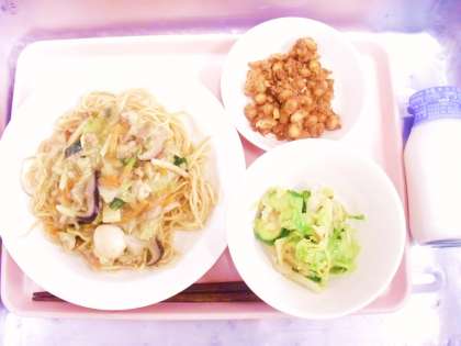 今日の給食「あんかけそば・牛乳・野菜の中華風味・多度豆」
