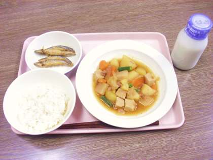 今日の給食「麦ごはん・牛乳・新じゃがのそぼろ煮・きびなごの天ぷら」