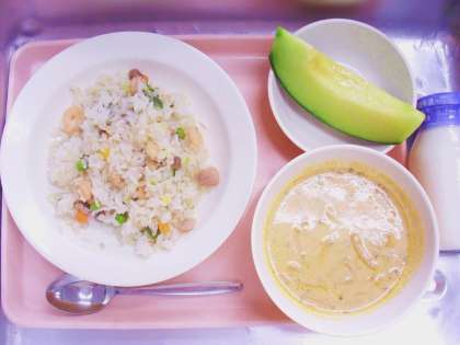 今日の給食「えびピラフ・牛乳・ユリアナスープ・メロン」