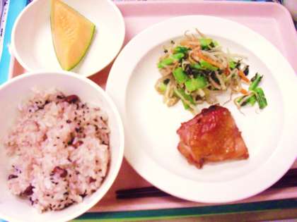 今日の給食「お赤飯・牛乳・鶏肉の照り焼き・野菜のごま和え・メロン」