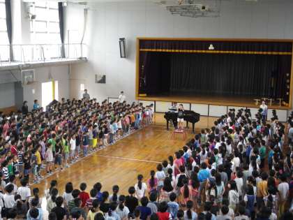 開校記念集会の時に全校で合唱する「松小坂道」(学校坂道松丘小バージョン)の練習をしました。体育館にきれいな歌声が響きました。