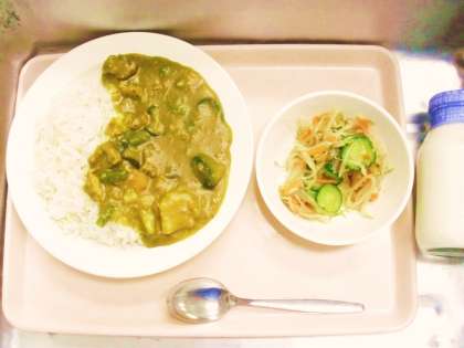 今日の給食「夏野菜カレー・牛乳・こんにゃくサラダ」