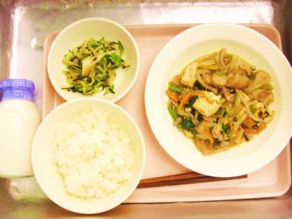 今日の給食「ごはん・牛乳・すき焼き煮・千切りサラダ」