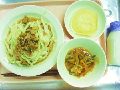 今日の給食「五目冷やしうどん・牛乳・魚の南蛮漬け・ミニ蒸しぱん」