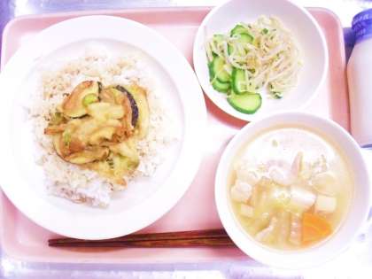 今日の給食「かき揚げ丼・牛乳・豆腐汁・野菜の甘酢和え」