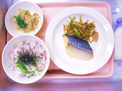 今日の給食「梅茶漬け・牛乳・サバの塩焼き・切り昆布のきんぴら・おひたし」