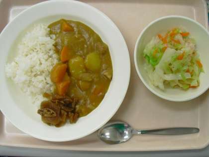 今日の給食「チキンカレーライス・福神漬け・キャベツサラダ・牛乳」