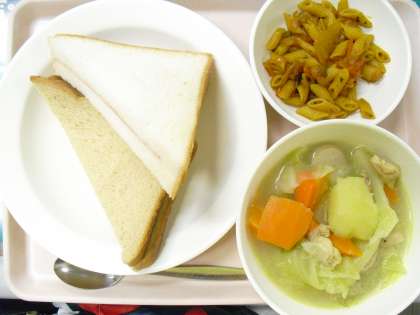 今日の給食「二色サンド・ポトフ・マカロニのソテー・牛乳」