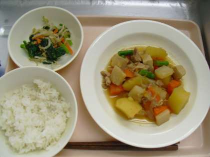 今日の給食「むぎごはん・肉じゃが・野菜のごまあえ・牛乳」