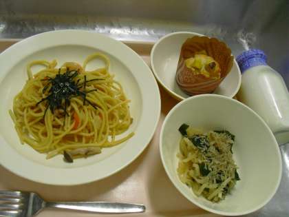 今日の給食「和風パスタ・大根サラダ・からいもマフィン・牛乳」