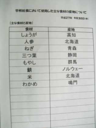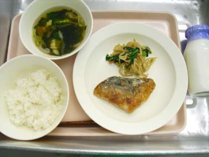 今日の給食「ごはん・さばの竜田あげ・もやしのカレーじょうゆかけ・すましじる・牛乳」