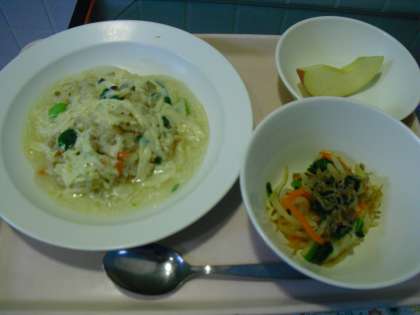 今日の給食「卵あんかけチャーハン・もやしの中華和え・りんご・牛乳」