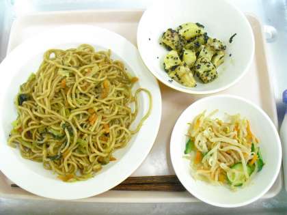 今日の焼きそばは新メニューで、カレー味にしました。子どもたちの反応は良かったです。ごまだれポテトは大学芋のじゃがいもバージョンです。さつまいもで作るよりも少しだけ柔らかい食感になります。