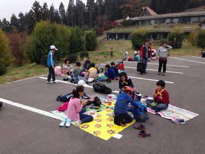 なかのビレジに到着しました。おうちの方に作っていただいたお弁当を美味しくいただいています。昼食が終わったら開室式です。