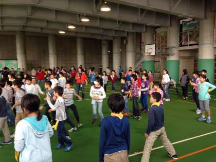 そのあと、屋根付き広場に集まって、学年レクリエーションを行いました。昼食を食べた後なので、みんなとても元気です。