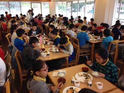 6時30分から朝会を行いました。川場村の天気は良好です。朝食を食べて山登りの準備をします。登山の目標は、「楽しく団結してはげましあいながら、あきらめずに頂上をまざそう」です。班のメンバーが助け合って雨乞山の頂上を目指してほしいです。きっと素晴らしい風景が見られると思います。