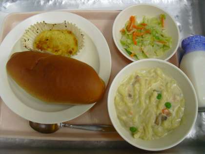 今日の給食「黒砂糖パン・マカロニのクリームに・コールスローサラダ・スイートポテト・牛乳」