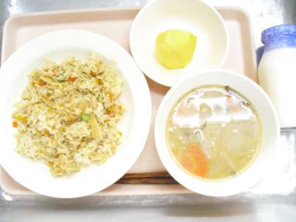 今日の給食「こぎつねごはん・呉汁・かき・牛乳」