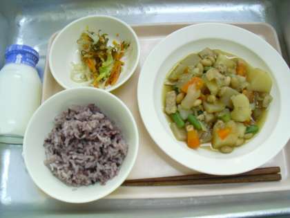 今日の給食「黒米ごはん・豆入り筑前煮・白菜のあえ物・牛乳」