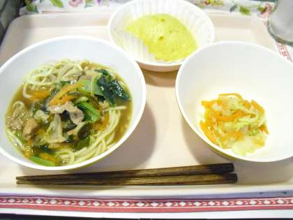 今日の給食「しょうゆラーメン・キャロット蒸しパン・ラーパーツァイ・牛乳」
