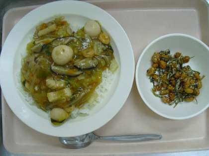 今日の給食「中華丼・大豆と小魚の甘辛あえ・牛乳」
