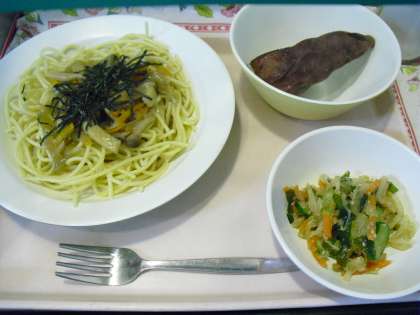 今日の給食「スパゲッティキノコソース・大根サラダ・焼き芋・牛乳」