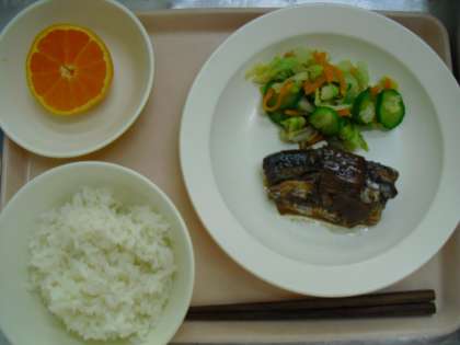 今日の給食「ごはん・さんまの生姜煮・即席漬け・菊花みかん・牛乳」