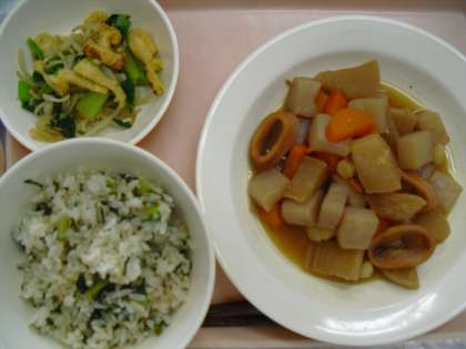 今日の給食「なめし・大根といかのにもの・カリカリ油あげ入りおひたし・牛乳」