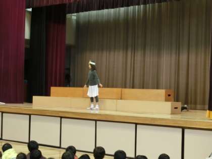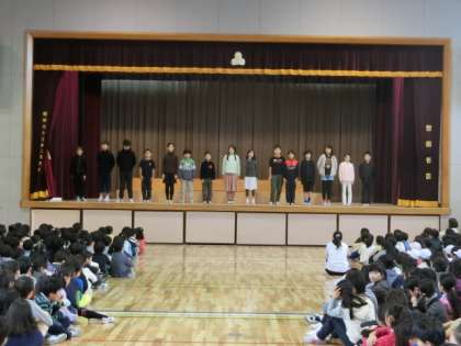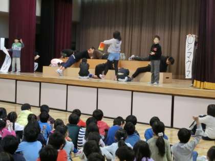 今日の児童集会は「プレゼントをわたせ!!ハッピーバースデイ集会」でした。「ある二人の兄弟が王女様にプレゼントをどちらが先に渡せるか、競争を始めました。」という内容で話が展開されました。途中で人文字を使ったクイズがあり、みんな楽しく答えていました。出されたクイズの答えの頭文字をあわせると「し・あ・わ・せ」となり、よいプレゼントが渡されました。集会委員もがんばって楽しませていました。よい時間をすごすごとができました。
